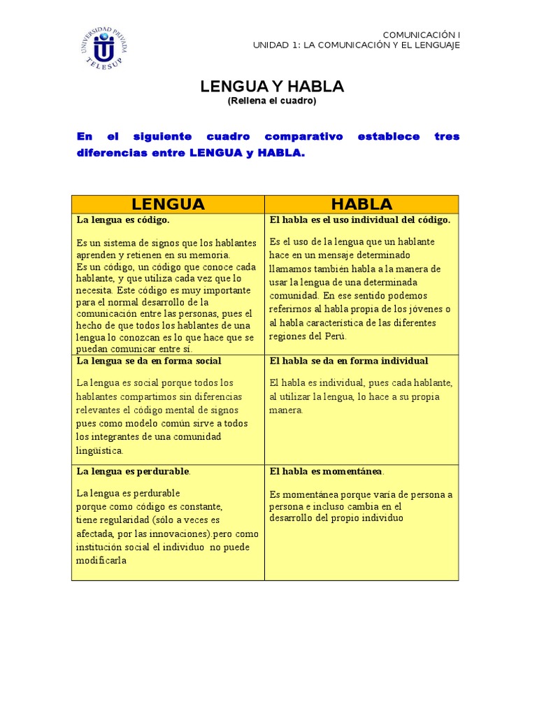 Cuadro Comparativo De Lenguaje Lengua Y Habla