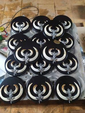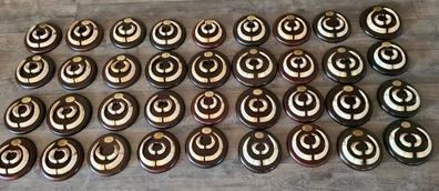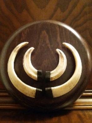 Ideal como regalo en sorteo de monterias. Foro de arma corta arma larga y armas de fuego. Pack de 3 embellecedores montura para colmillos de jabalí sobre tabla porta trofeo de caza.