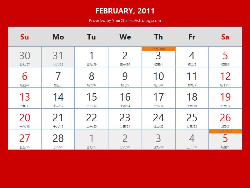 Sundays are in red Solar Terms 1. Daylight Saving Time DST correction is not in effect. Calendars online and print friendly for any year and month. Chinese calendar February 2011 with lunar dates holidays auspicious dates for wedding Grand Opening Moving. Here is a Chinese wedding calendar for 2011. Calendars online and print friendly for any year and month. Rat Ox Tiger Rabbit. Rat Ox Tiger Rabbit. May 12 2011 12 th day of the month.